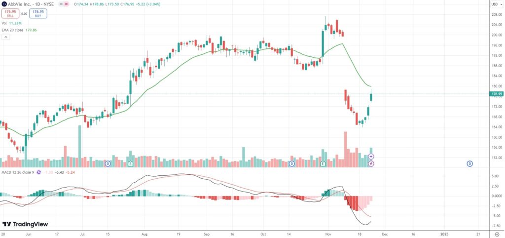 The shares of AbbVie Inc (ABBV) closed 3.04% ($5.22) higher at $176.95 in New York on Friday. It has been the stock’s largest single-session gain since October 30th.