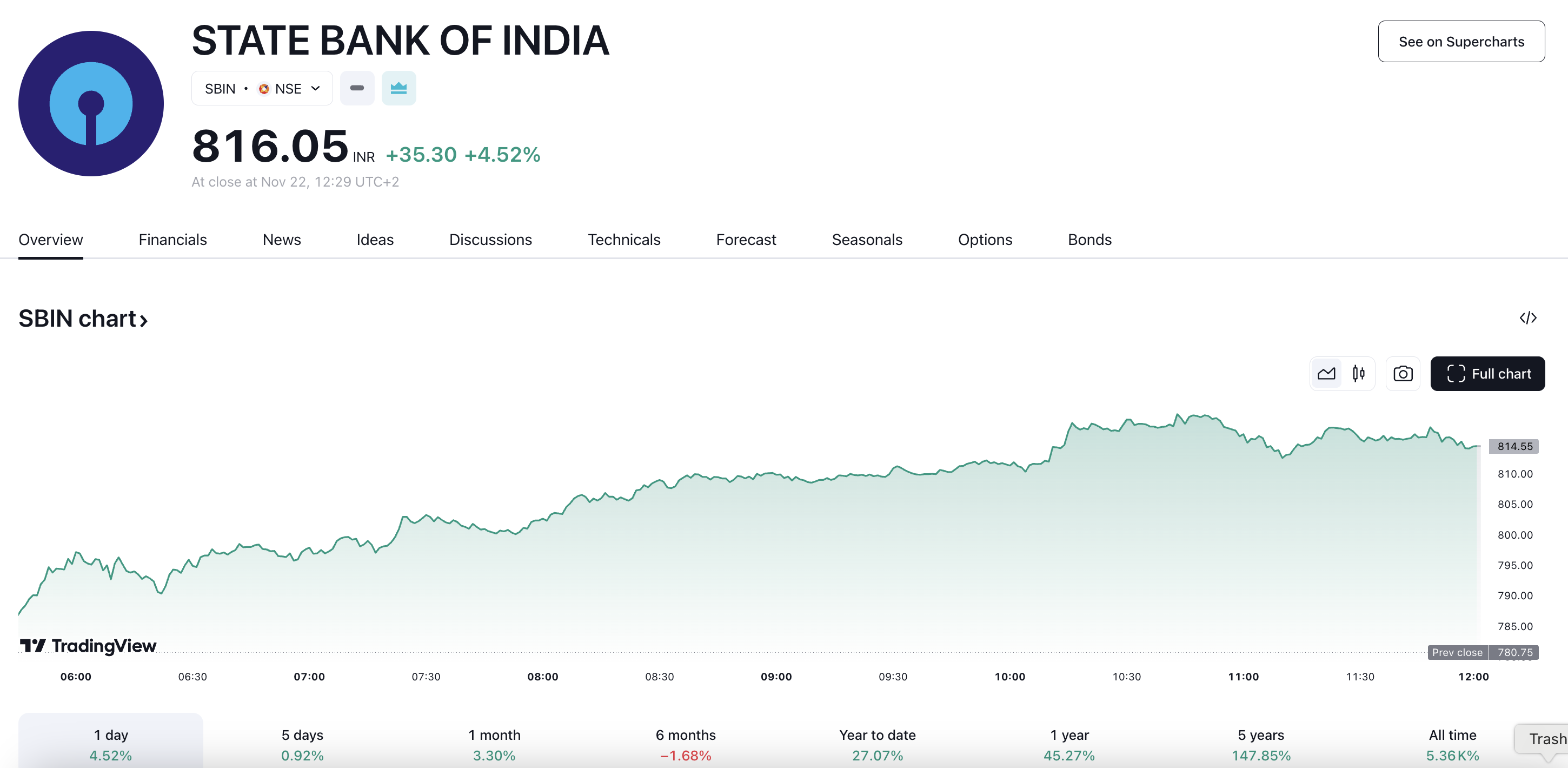 The State Bank of India (SBI) share price has experienced a significant boost, rising 4.52% to ₹816.05 on November 22, 2024. This upward trend is in contrast to its peers, with HDFC Bank and Axis Bank experiencing declines, while ICICI Bank and Kotak Mahindra Bank are seeing gains.