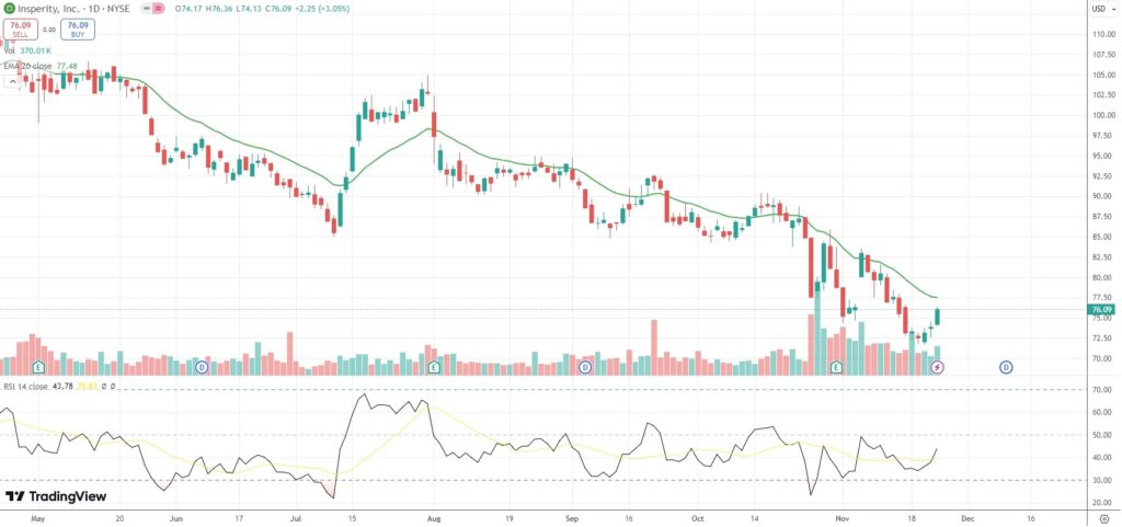 The shares of Insperity Inc (NSP) closed 3.05% ($2.25) higher at $76.09 in New York on Friday, as they extended the gains from the previous two market sessions.