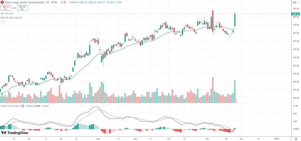 The shares of Jones Lang Lasalle Inc (JLL) closed 7.75% ($20.40) higher at $283.67 in New York on Monday. It has been the stock’s largest single-session gain since February 15th.