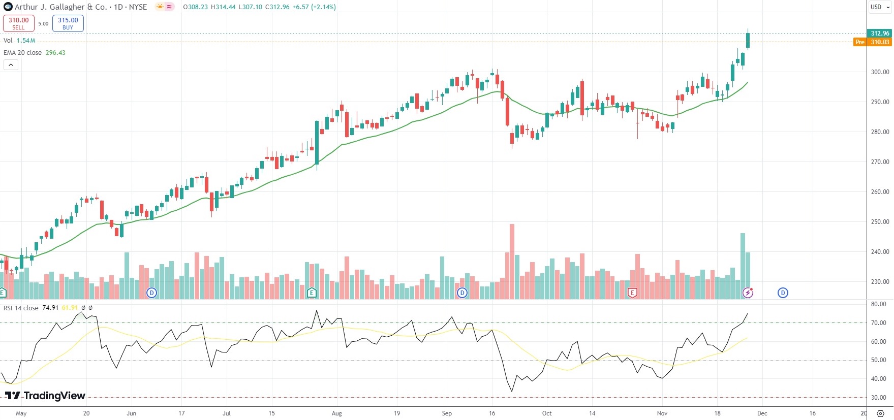 The shares of Arthur J. Gallagher & Co (AJG) closed 2.14% ($6.57) higher at $312.96 in New York on Tuesday, as they extended the gains from the previous four market sessions.