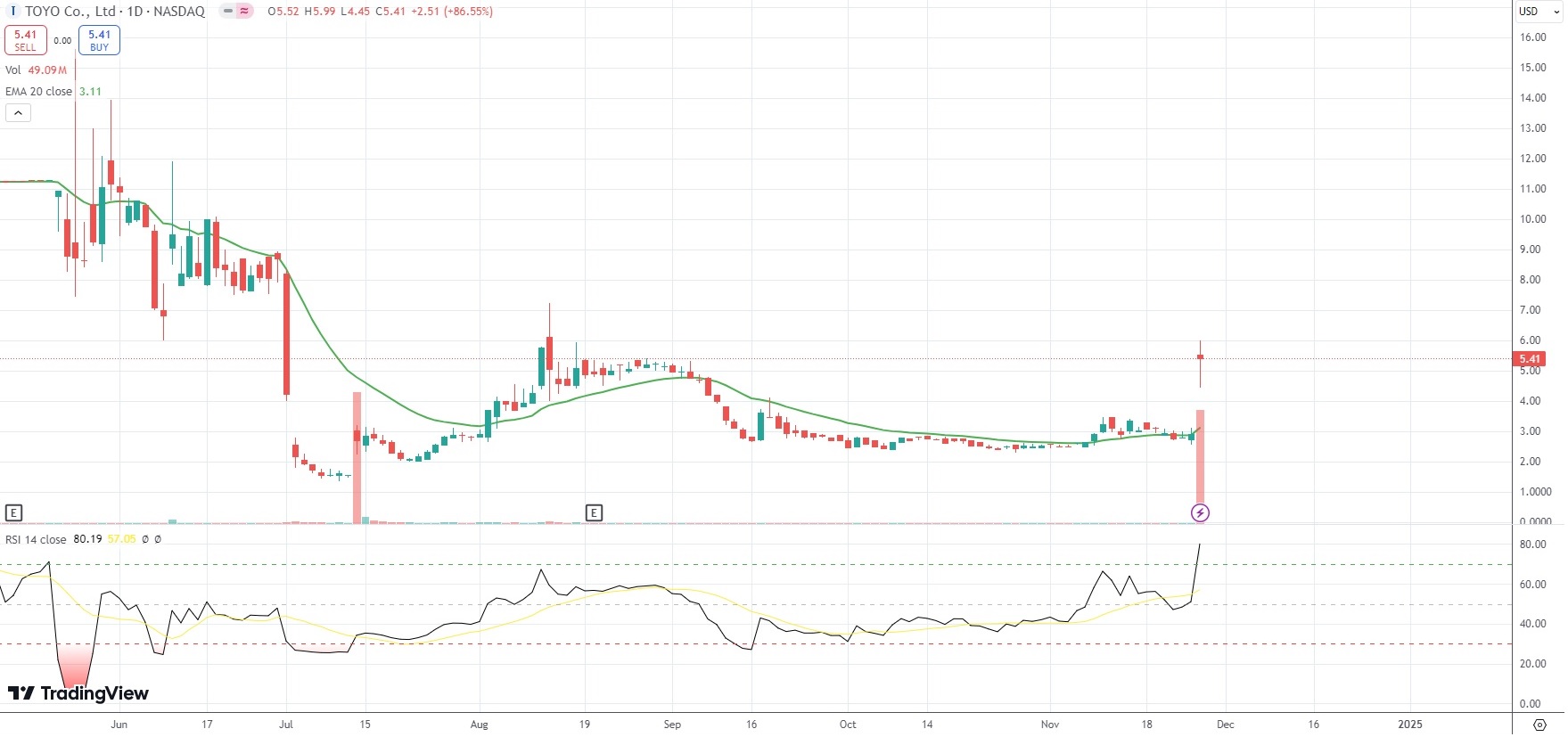 The shares of TOYO Co. Ltd (TOYO) closed 86.55% ($2.51) higher at $5.41 on Nasdaq on Tuesday, as they extended the gains from the previous two market sessions.