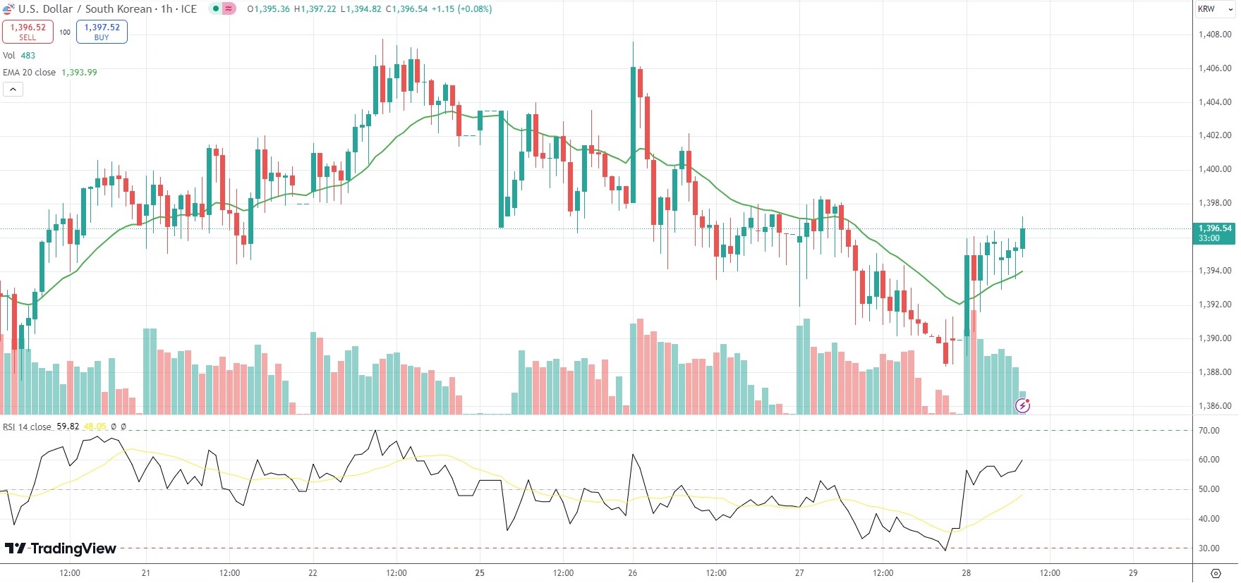 The South Korean Won was 0.58% weaker on the day against the US Dollar, with the USD/KRW currency pair last trading at 1,396.64.