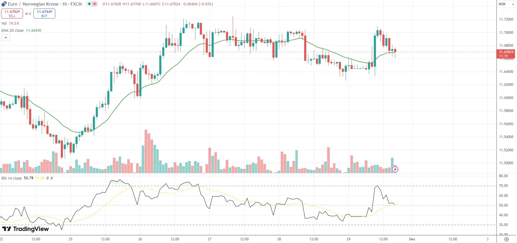 The Norwegian Krone was 0.22% weaker on the day against the Euro, with the EUR/NOK currency pair last trading at 11.6704.