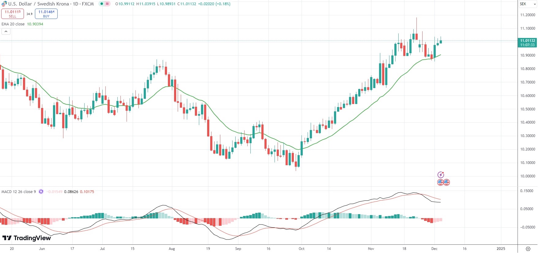 The USD/SEK currency pair was last edging up 0.18% to trade at 11.0114. The exotic Forex pair was holding near a one-week high of 11.0391.
