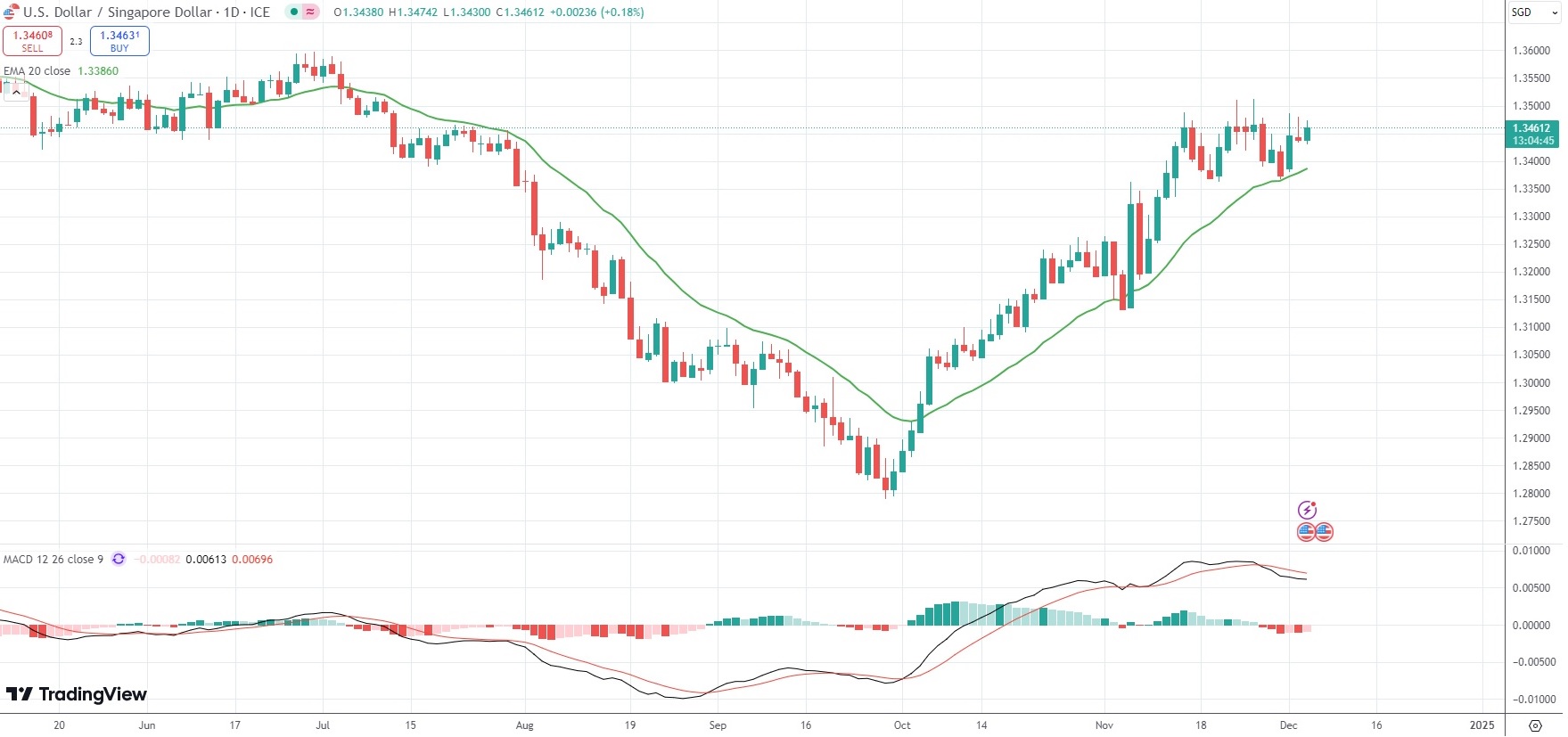The USD/SGD currency pair was last edging up 0.16% to trade at 1.3461. The exotic Forex pair was holding near a one-week peak of 1.3486.