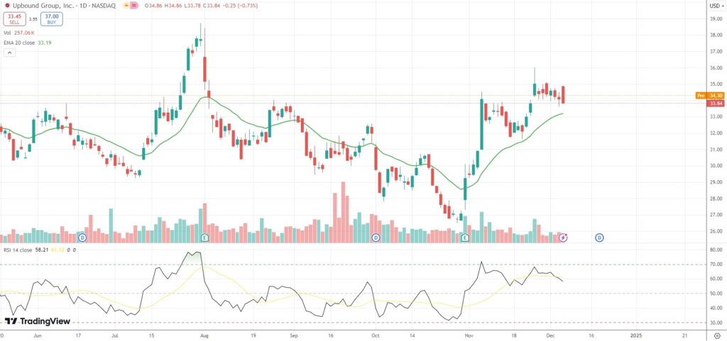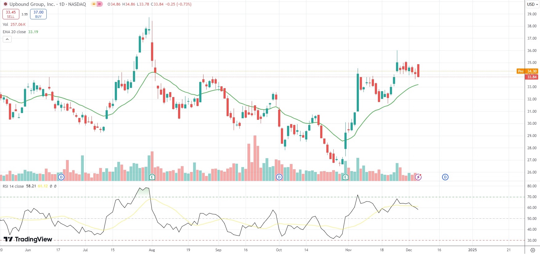The shares of Upbound Group Inc (UPBD) closed 0.73% ($0.25) lower at $33.84 on Nasdaq on Thursday, as they extended the losses from the previous two market sessions.