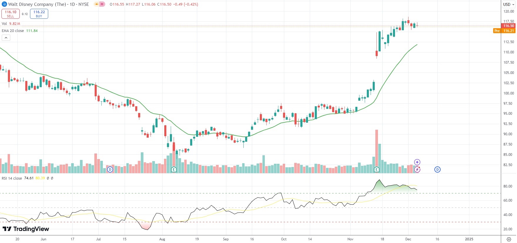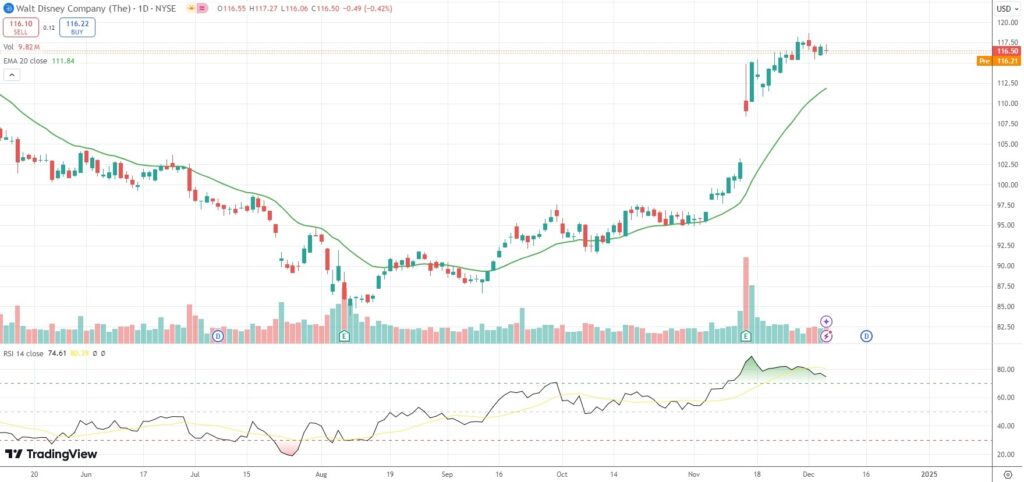The shares of Walt Disney Company (DIS) closed 0.42% ($0.49) lower at $116.50 in New York on Thursday, as they reversed a gain from the previous market session.