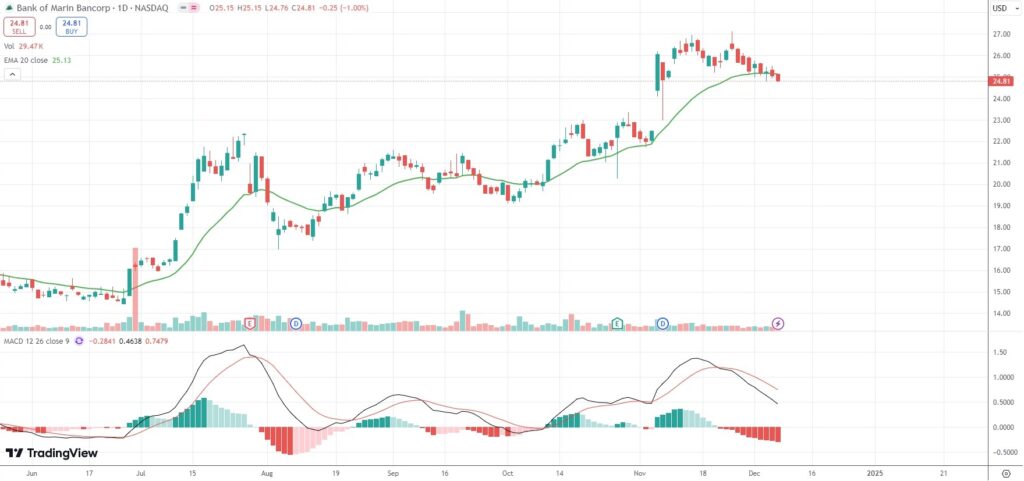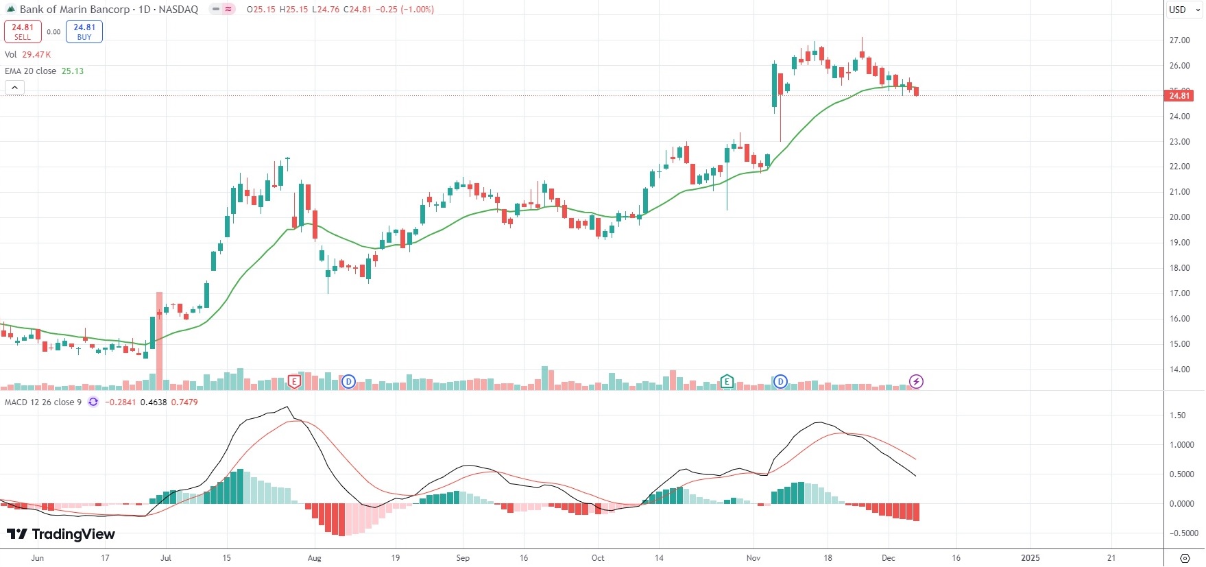 The shares of Bank of Marin Bancorp (BMRC) closed 1.00% ($0.25) lower at $24.81 on Nasdaq on Friday, as they extended the loss from the previous market session.