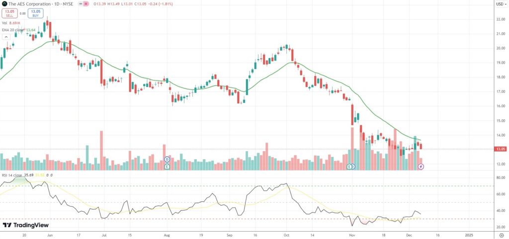 The shares of The AES Corporation (AES) closed 1.81% ($0.24) lower at $13.05 in New York on Friday, as they extended the loss from the previous market session.