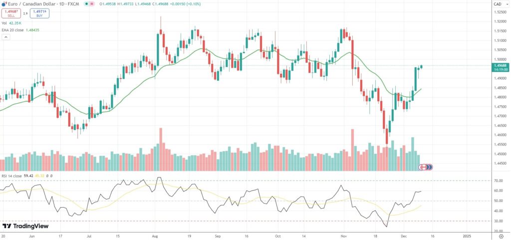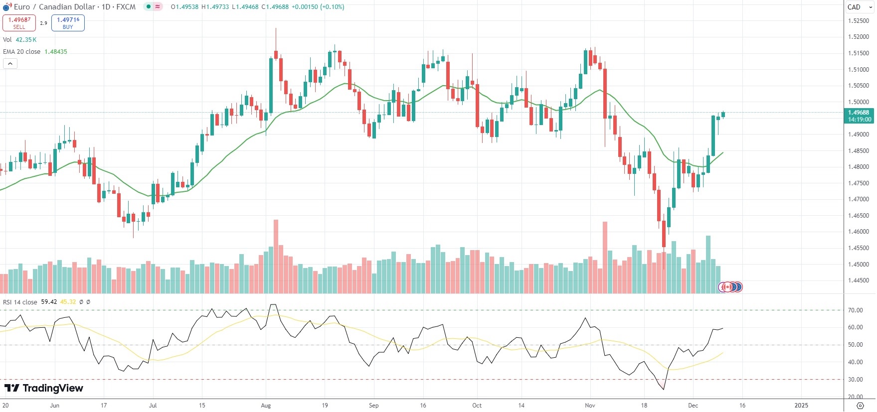 The EUR/CAD currency pair scaled a fresh one-month high of 1.4973 on Tuesday, after German inflation data and ahead of the outcome of the Bank of Canada’s and the European Central Bank’s policy meetings this week.