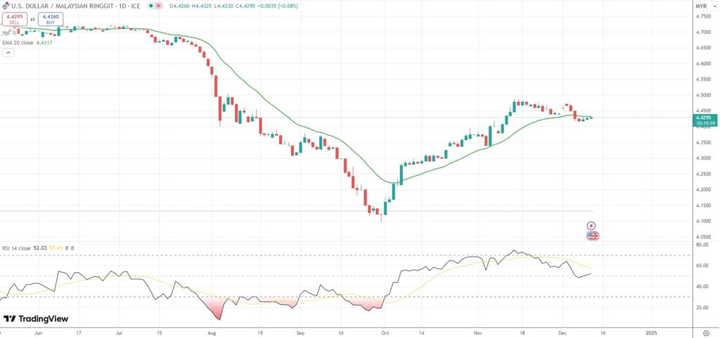 The USD/MYR currency pair was last inching up 0.08% to trade at 4.4295. The exotic Forex pair earlier advanced to 4.4325, or a level last seen on December 5th.