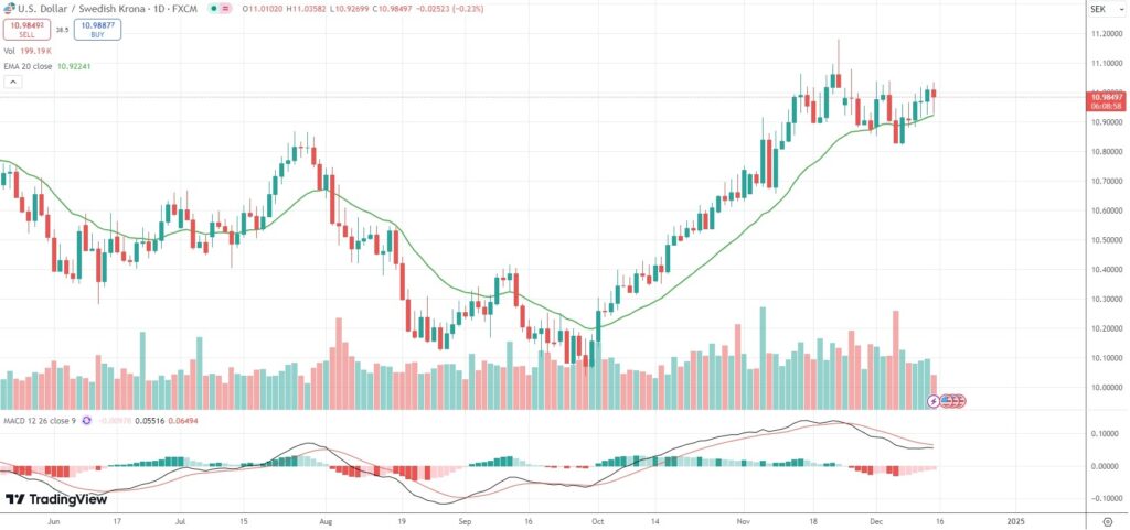 The Swedish Krona was 0.23% firmer on the day against the US Dollar, with the USD/SEK currency pair last trading at 10.9844.