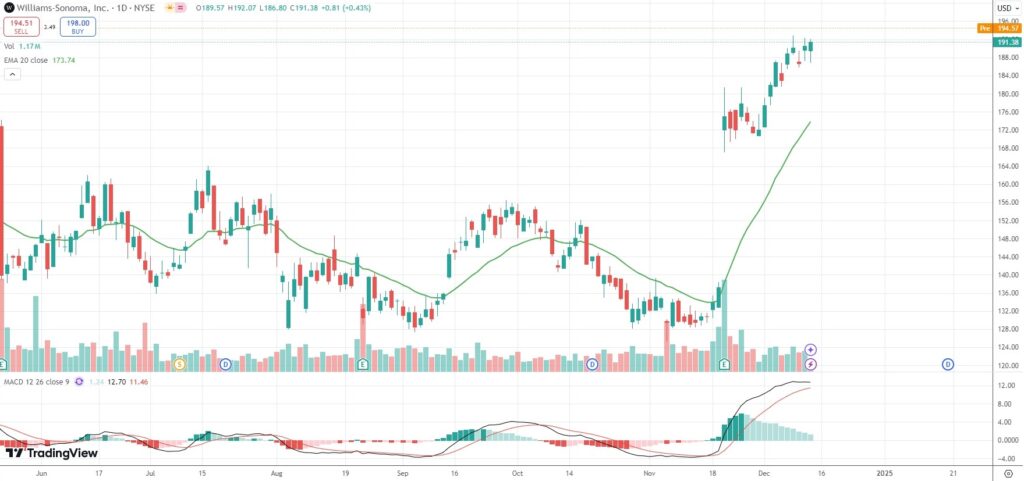 The shares of Williams-Sonoma Inc (WSM) closed 0.43% ($0.81) higher at $191.38 in New York on Thursday, as they extended the gain from the previous market session.