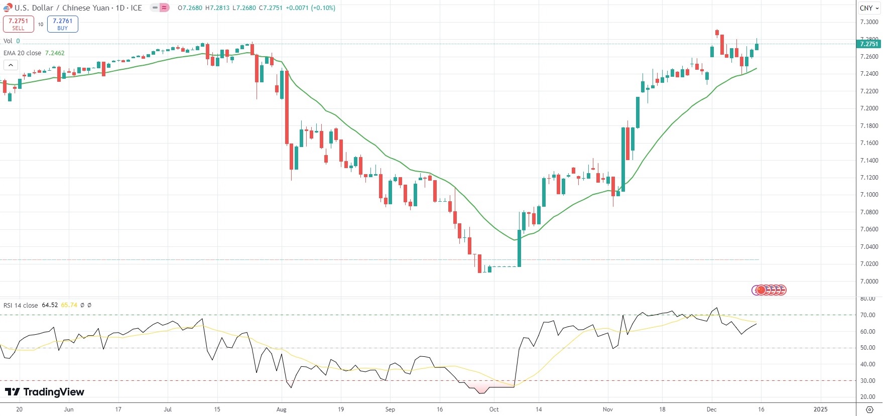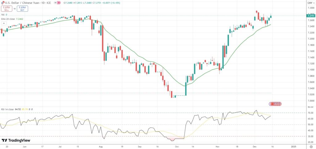 The USD/CNY currency pair settled 0.10% higher at 7.2751 on Friday. For the week, the currency pair edged up 0.08%.