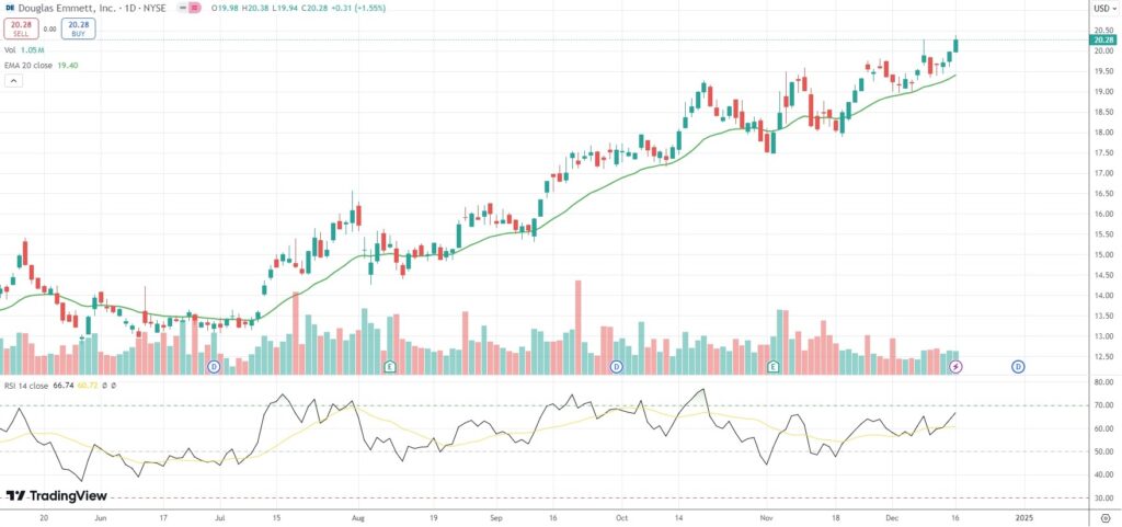 The shares of Douglas Emmett Inc (DEI) closed 1.55% ($0.31) higher at $20.28 in New York on Monday, as they extended the gains from the previous three market sessions.