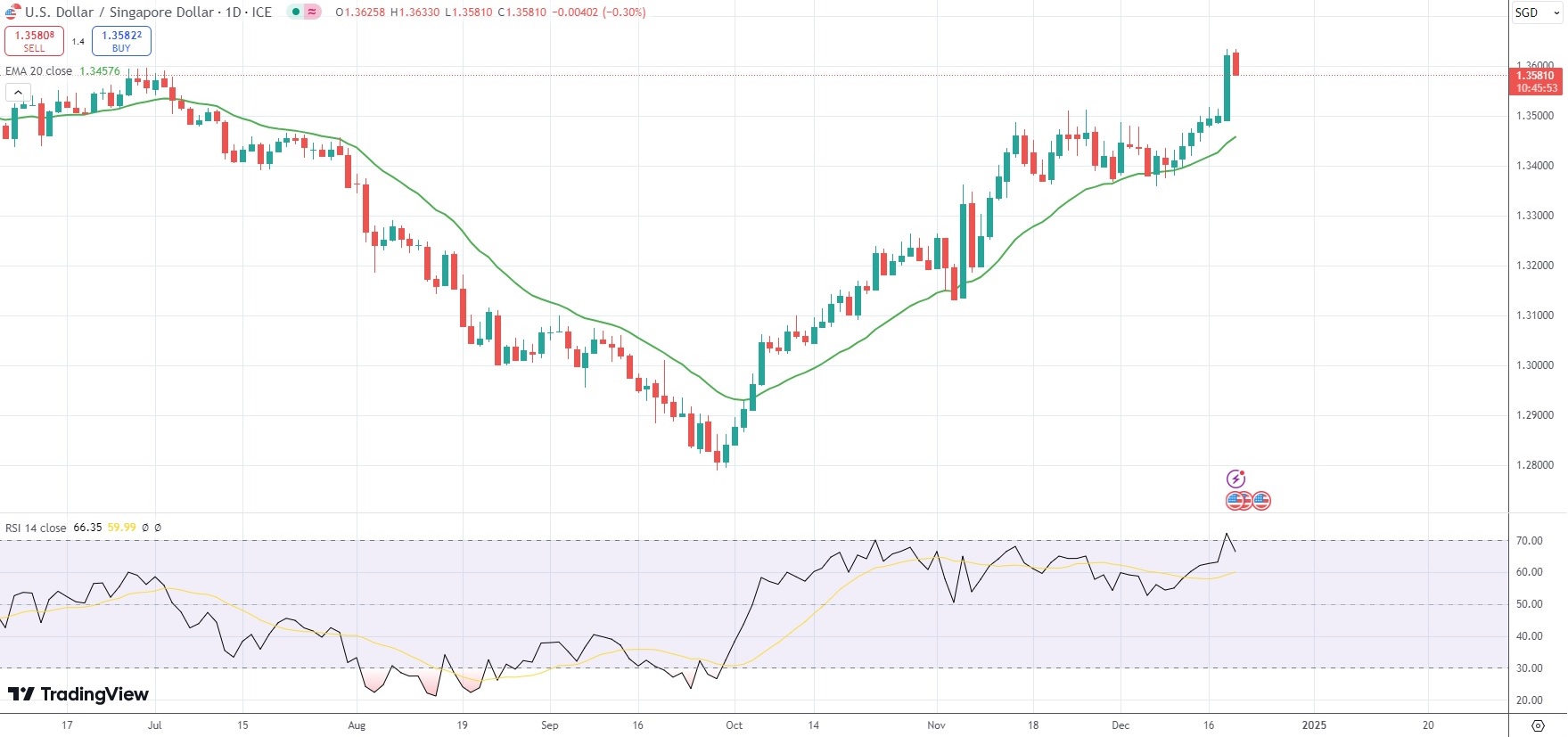 The USD/SGD currency pair traded in proximity to a fresh 7 1/2-month high of 1.3634 on Thursday, after the Federal Reserve signaled fewer rate cuts in 2025 due to robust GDP growth and persistent inflation.