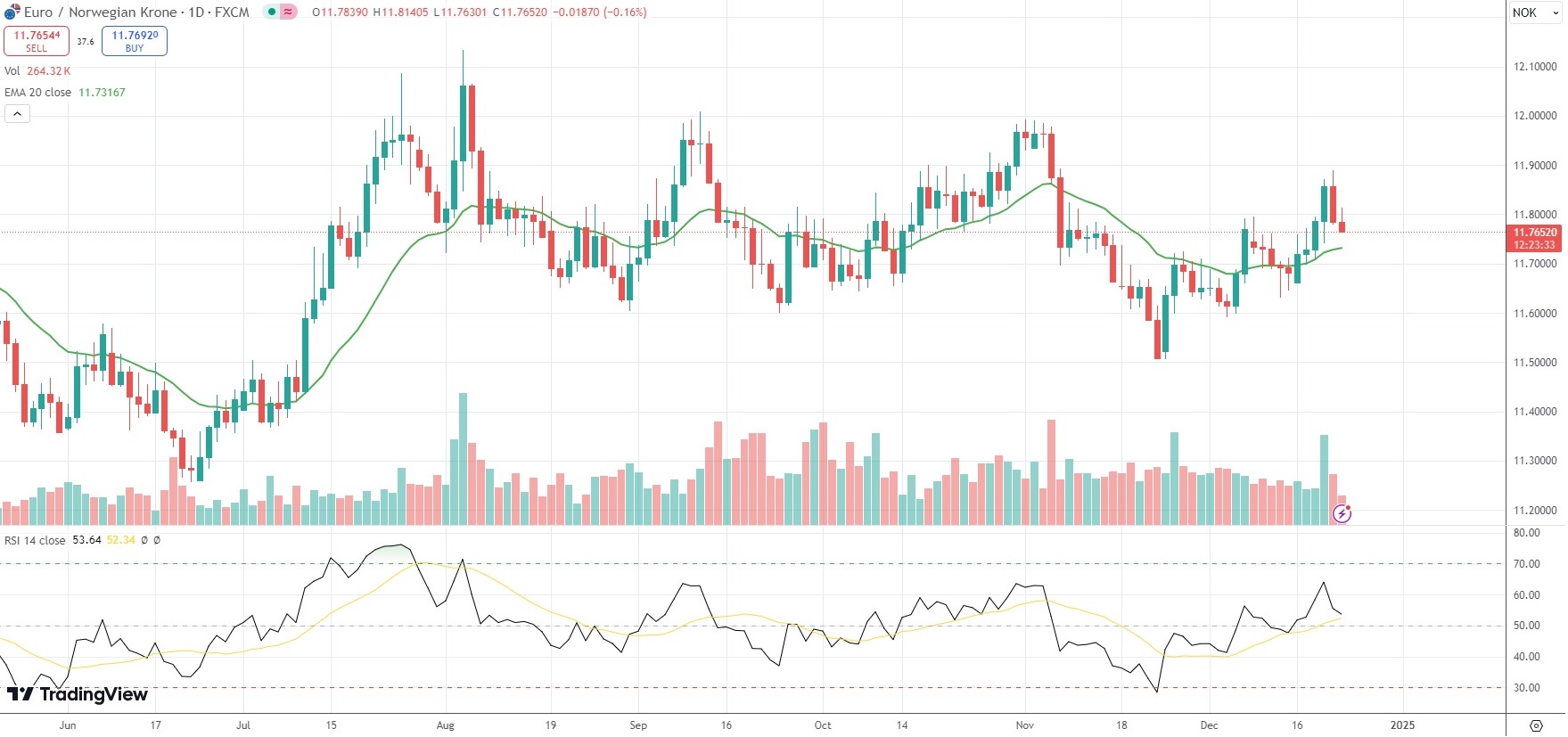The Norwegian Krone was last 0.16% firmer on the day against the Euro, with the EUR/NOK currency pair trading at 11.7653.
