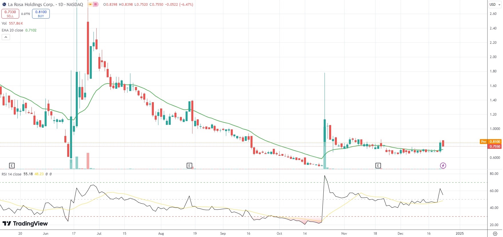 The shares of La Rosa Holdings Corp (LRHC) closed 6.47% ($0.0522) lower at $0.7550 on Nasdaq on Monday, as they reversed a gain from the previous market session.