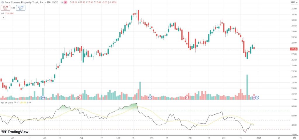 The shares of Four Corners Property Trust Inc (FCPT) went down 2.43% in 2023, compared with a 10.99% gain for the benchmark index, NYSE Composite (NYA).