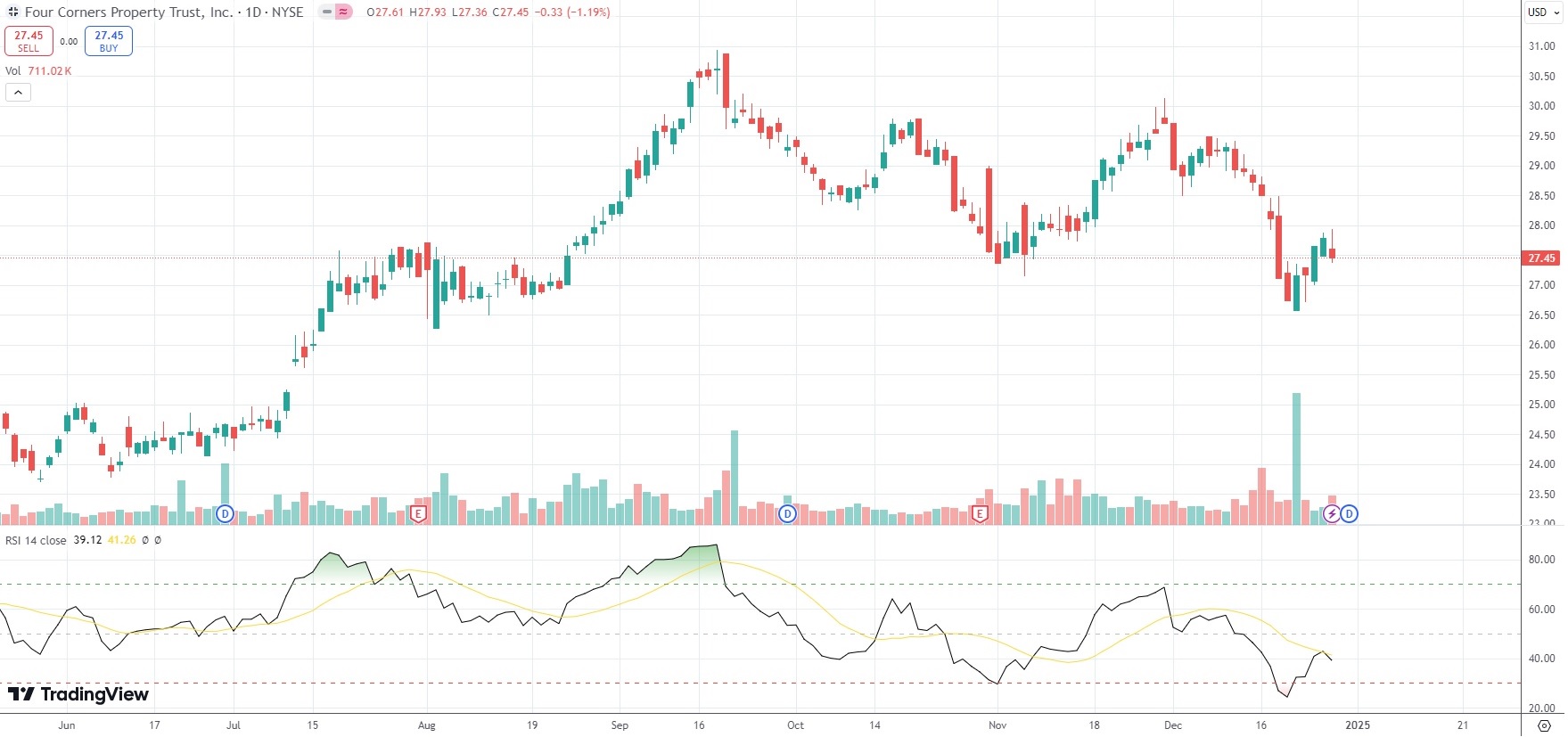 The shares of Four Corners Property Trust Inc (FCPT) closed 1.19% ($0.33) lower at $27.45 in New York on Friday, as they snapped a four-day streak of gains.