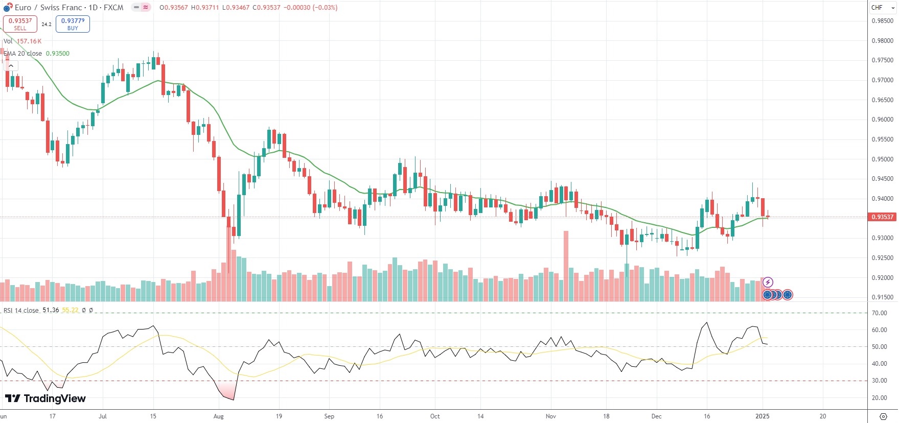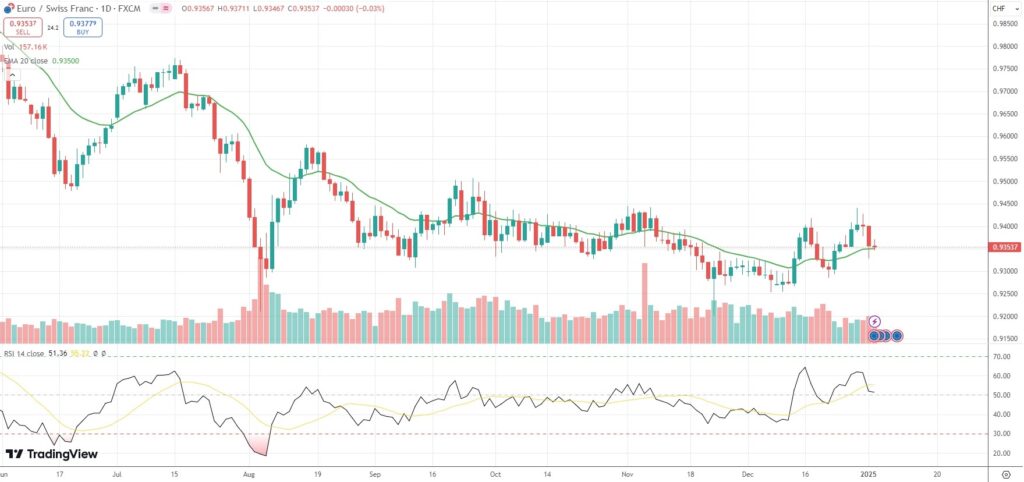 The EUR/CHF currency pair settled 0.03% lower at 0.9353 on Friday. For the week, the minor currency pair went down 0.42%, as it reversed a gain from the prior weekly period.