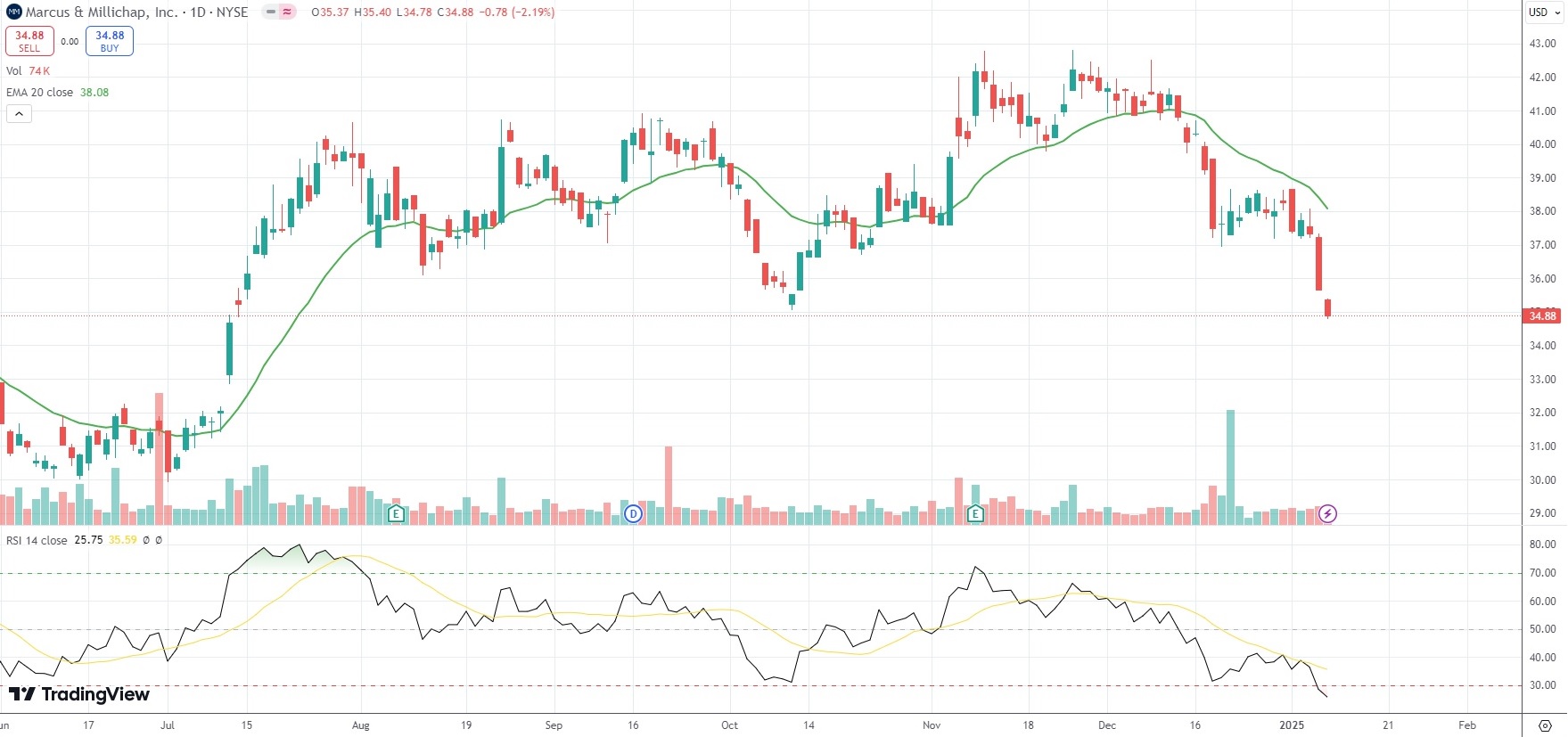 The shares of Marcus & Millichap Inc (MMI) went down 12.41% in 2024, compared with a 13.32% gain for the benchmark index, NYSE Composite (NYA).