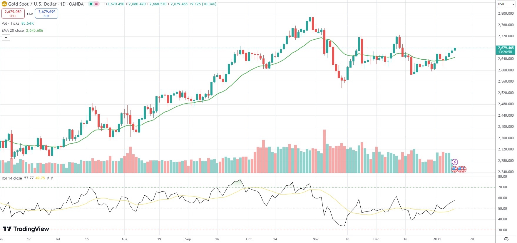 Spot Gold was last edging up 0.34% to trade at $2,679.75 per troy ounce.