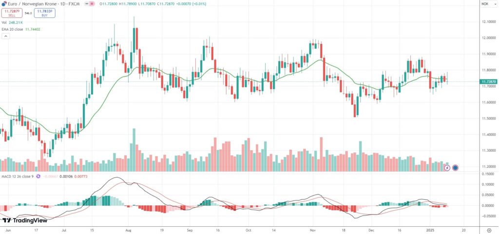 The EUR/NOK currency pair settled with little change at 11.7287 on Friday. For the week, the exotic currency pair went up 0.30%.