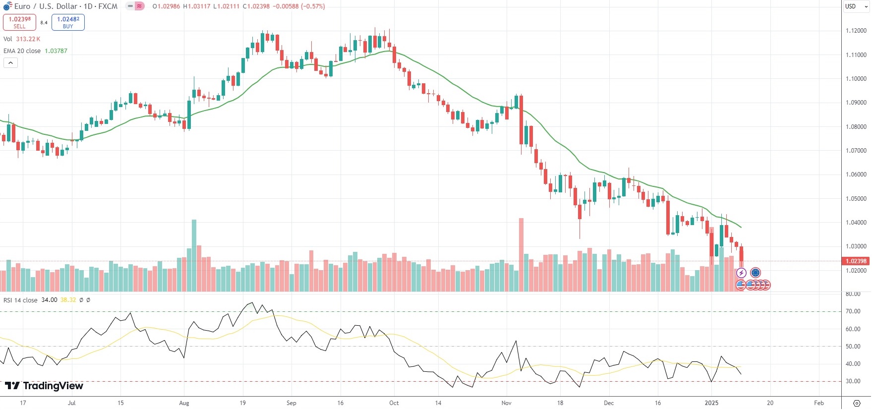 The EUR/USD currency pair settled 0.57% lower at 1.0240 on Friday. For the week, the major currency pair went down 0.66%.