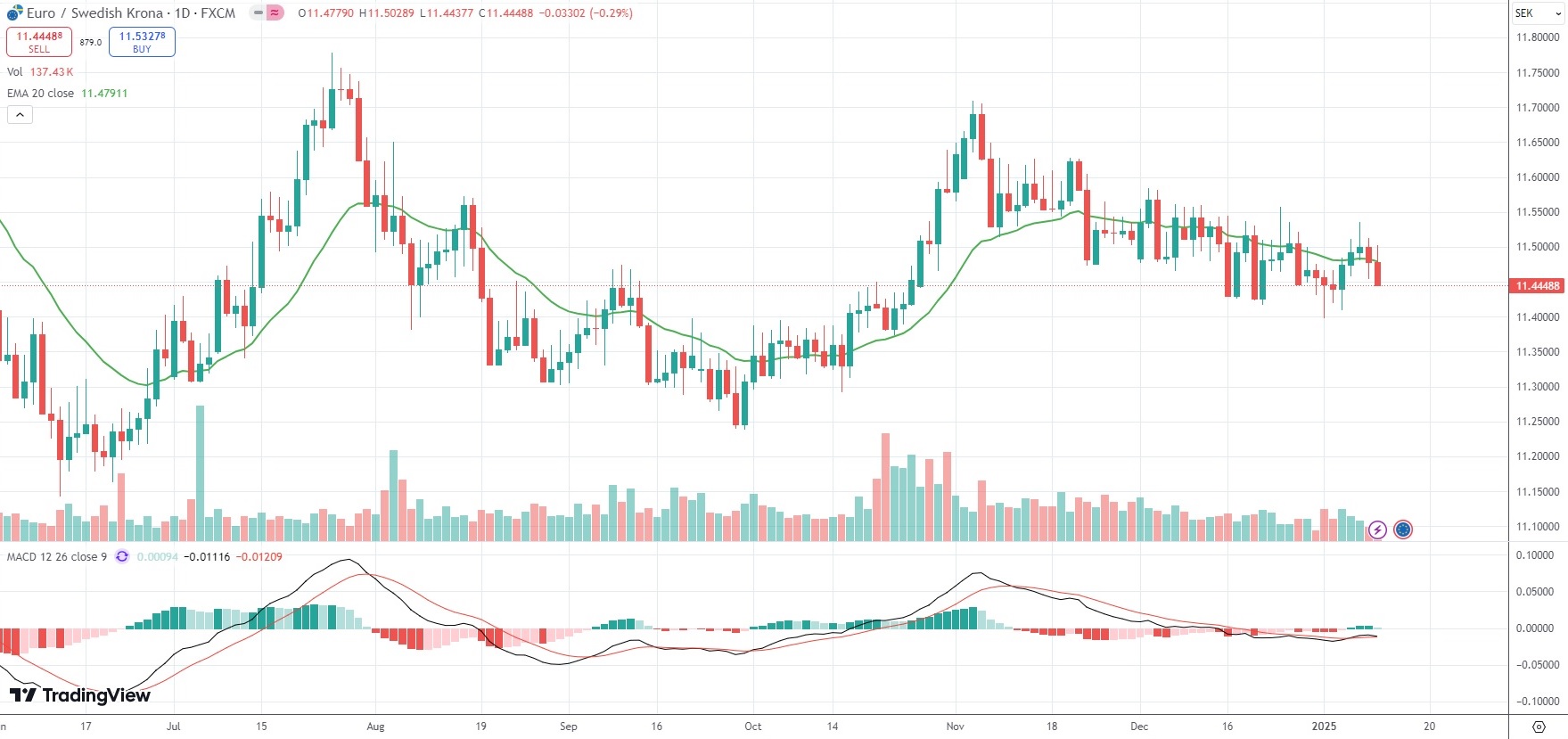 The EUR/SEK currency pair settled 0.29% lower at 11.4448 on Friday. For the week, the exotic currency pair remained little changed.