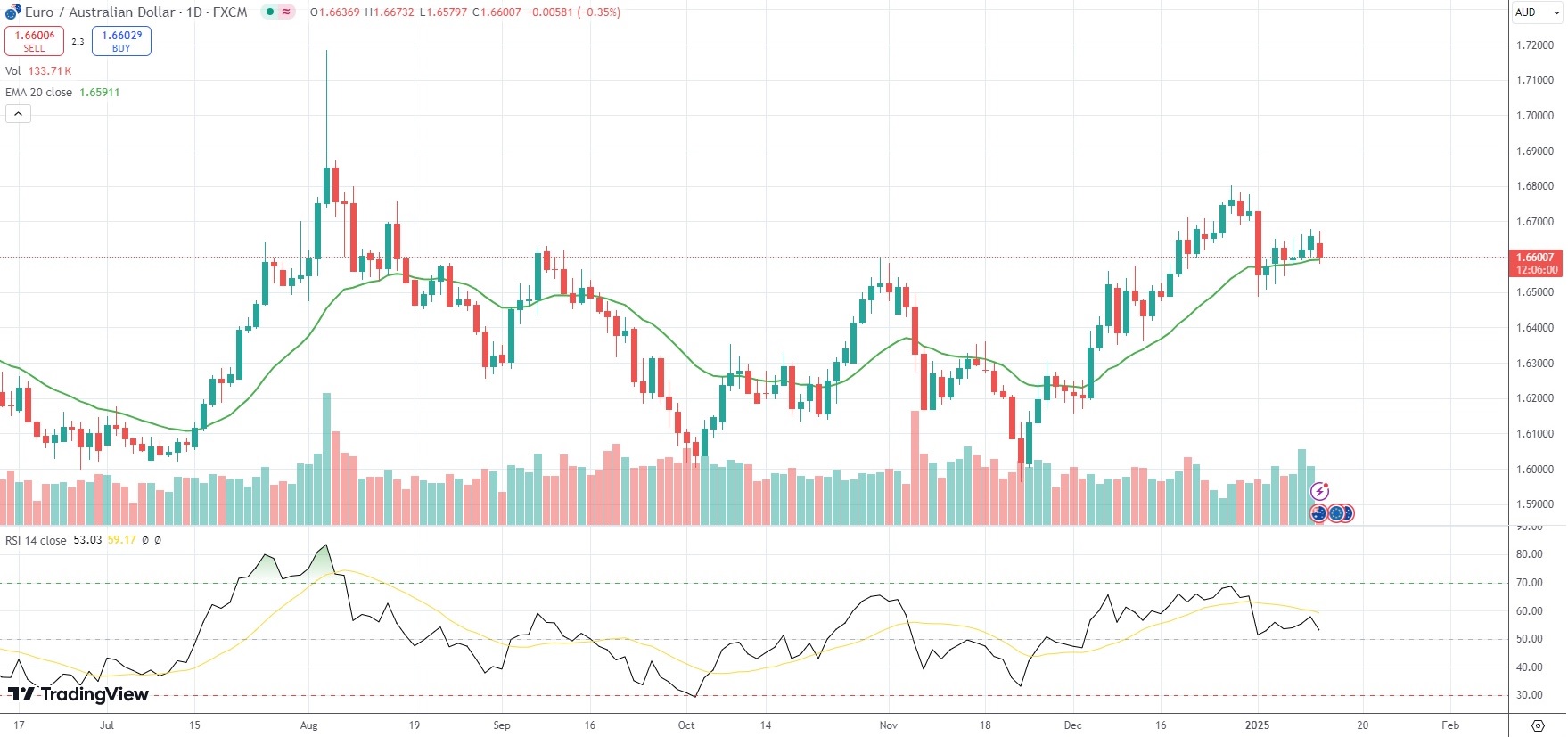 The Australian Dollar was 0.35% stronger on the day against the Euro, with the EUR/AUD currency pair last trading at 1.6601.