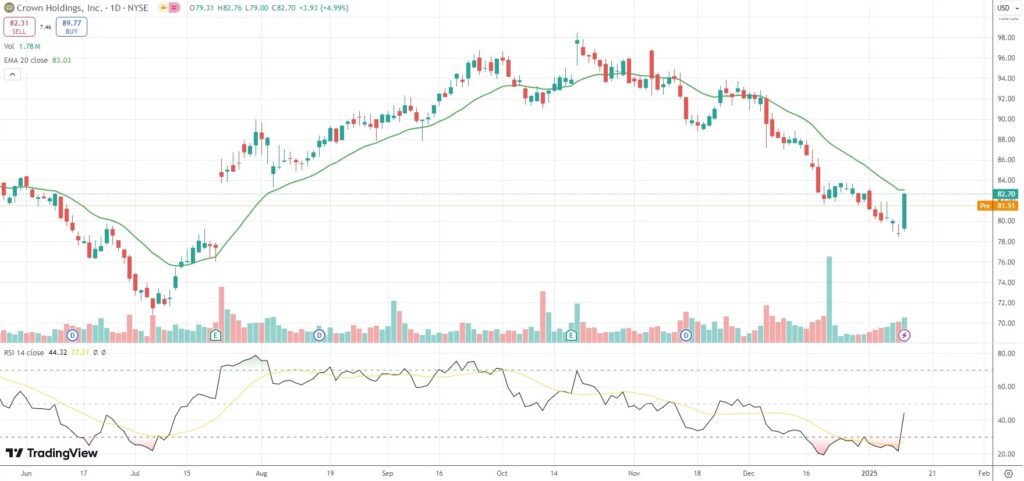 The shares of Crown Holdings Inc (CCK) closed 4.99% ($3.93) higher at $82.70 in New York on Monday. It has been the sharpest single-session gain since July 23rd 2024.