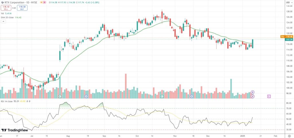 The shares of RTX Corp (RTX) closed 2.28% ($2.63) higher at $117.74 in New York on Monday. It has been the sharpest single-session gain since November 8th 2024.