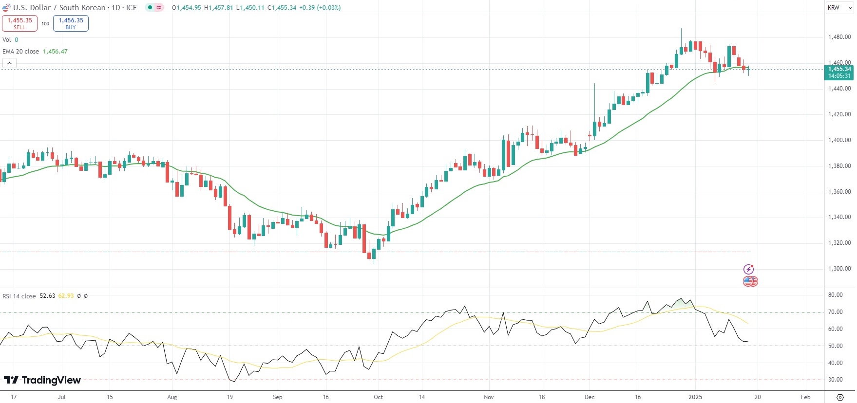 The South Korean Won was little changed on the day against the US Dollar, with the USD/KRW currency pair last trading at 1,454.87.