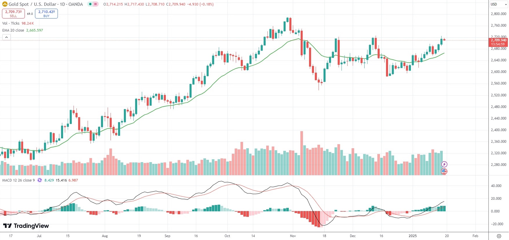 Spot Gold was last edging down 0.18% to trade at $2,709.95 per troy ounce. Yesterday the yellow metal went up as high as $2,724.78 per troy ounce, or its strongest price level since December 12th 2024.