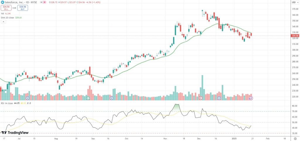 The shares of Salesforce Inc (CRM) closed 1.43% ($4.56) higher at $324.56 in New York on Friday, as they snapped a two-day streak of losses.