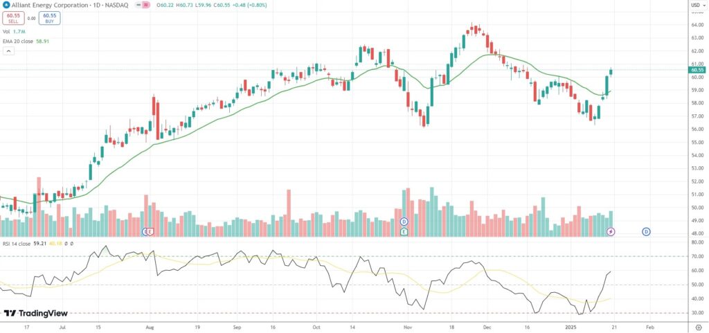 The shares of Alliant Energy Corp (LNT) closed 0.80% ($0.48) higher at $60.55 on Nasdaq on Friday. It has been the highest closing price for the stock since December 10th 2024.