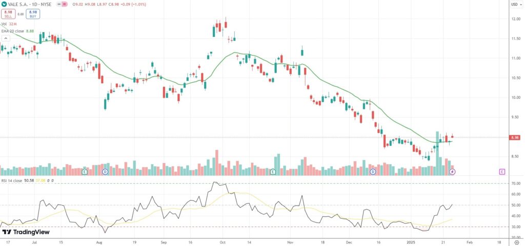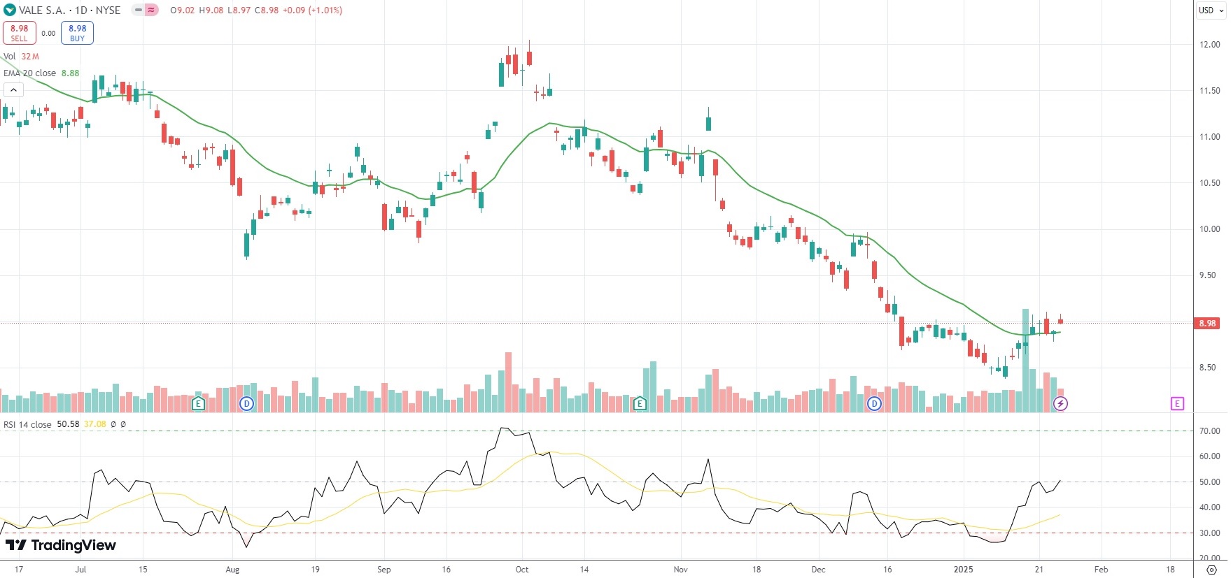 The shares of Vale S.A. (VALE) went down 44.07% in 2024, compared with a 13.32% gain for the benchmark index, NYSE Composite (NYA).