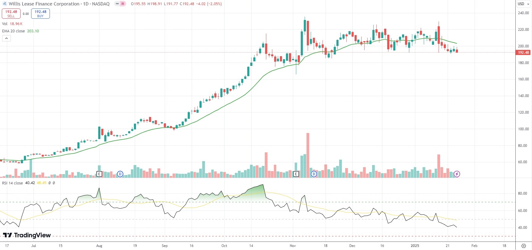 The shares of Willis Lease Finance Corp (WLFC) closed 2.05% ($4.02) lower at $192.48 on Nasdaq on Friday.