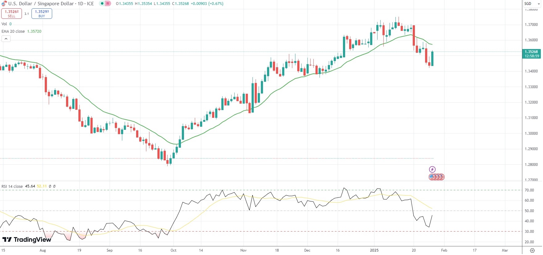 The USD/SGD currency pair was last gaining 0.67% on the day to trade at 1.3527.