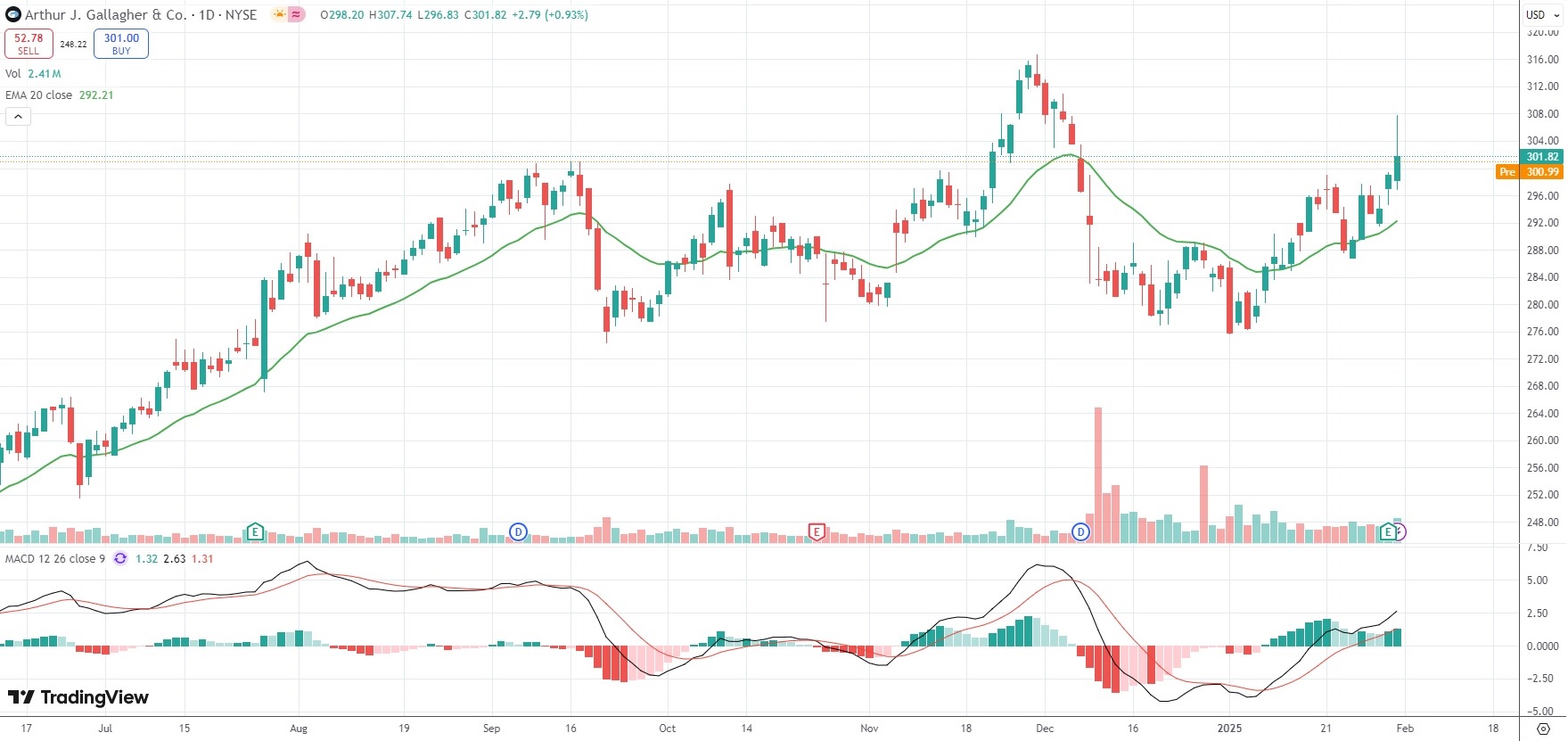 The shares of Arthur J. Gallagher & Co (AJG) closed 0.93% ($2.79) higher at $301.82 in New York on Friday.