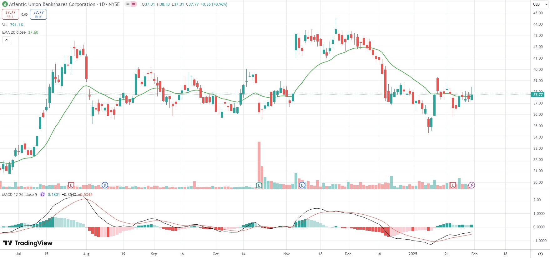 The shares of Atlantic Union Bankshares Corp (AUB) closed 0.96% ($0.36) higher at $37.77 in New York on Friday. It has been the sharpest single-session gain for the stock since January 27th.