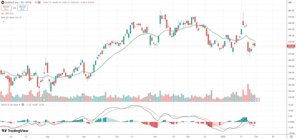 The shares of Hubbell Inc (HUBB) closed 0.83% ($3.56) lower at $423.01 in New York on Friday, as they snapped a two-day streak of gains.