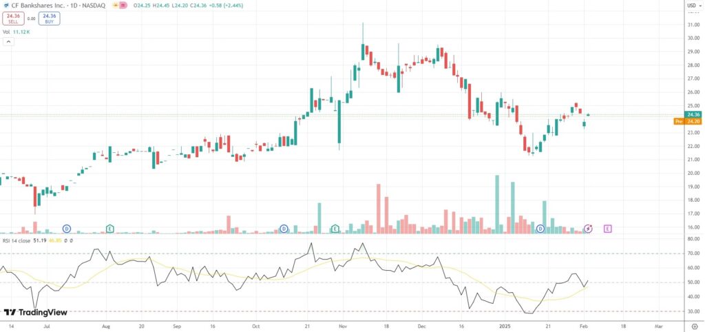 The shares of CF Bankshares Inc (CFBK) closed 2.44% ($0.58) higher at $24.36 on Nasdaq on Tuesday, as they snapped a two-day streak of losses.
