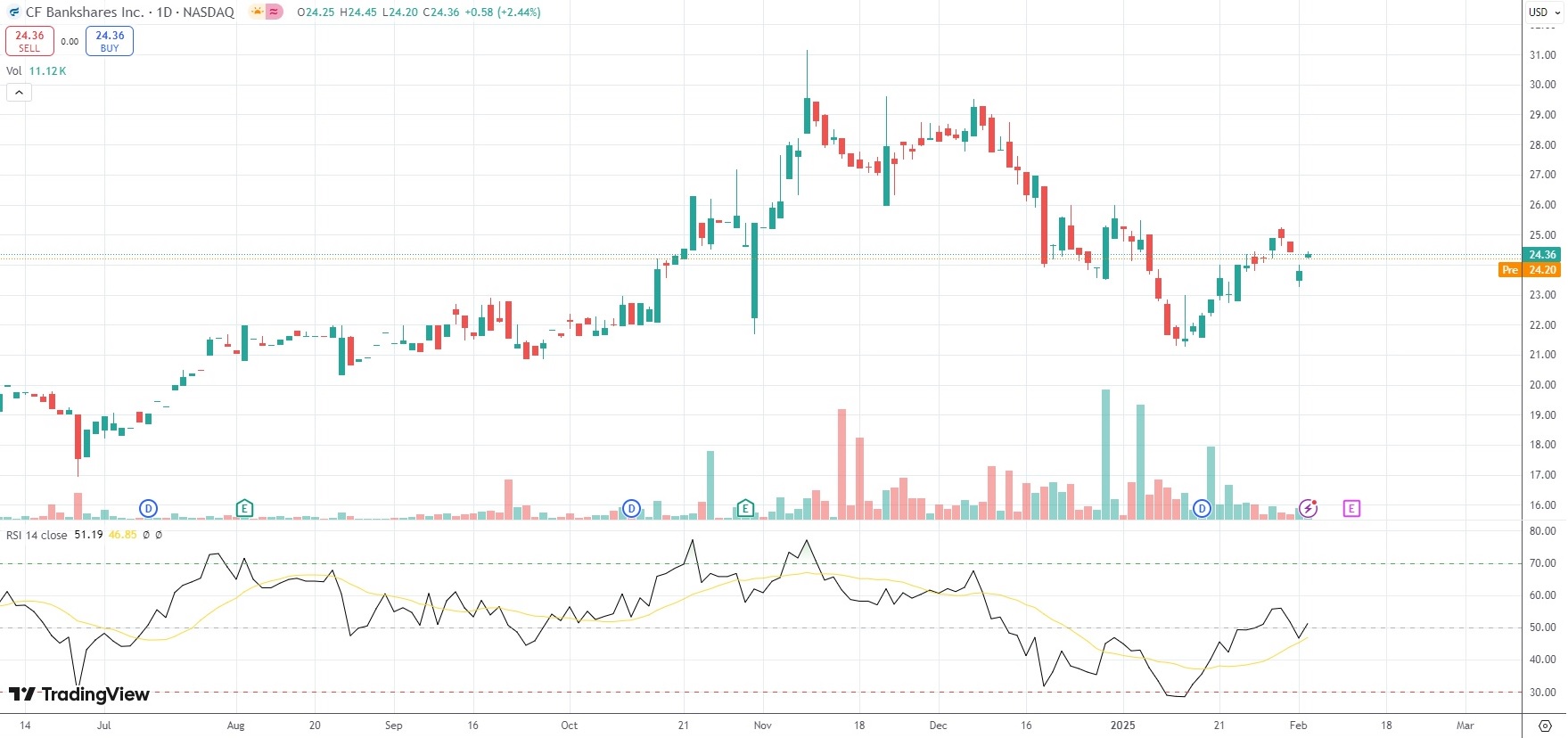 The shares of CF Bankshares Inc (CFBK) went up 30.97% in 2024, compared with a 28.64% gain for the benchmark index, Nasdaq Composite (IXIC).