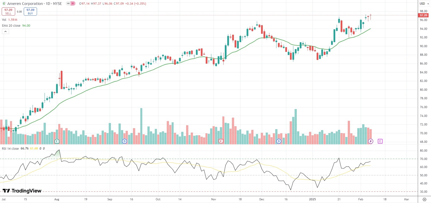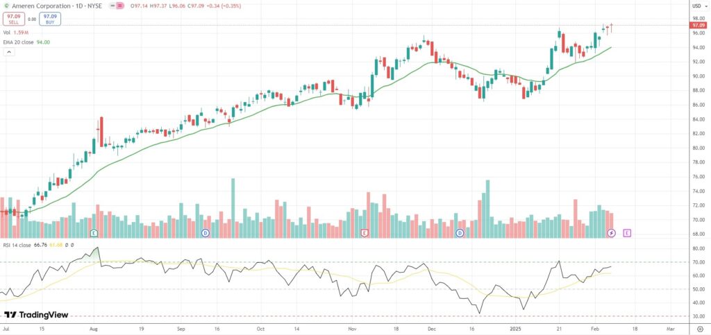 The shares of Ameren Corp (AEE) closed 0.35% ($0.34) higher at $97.09 in New York on Friday.