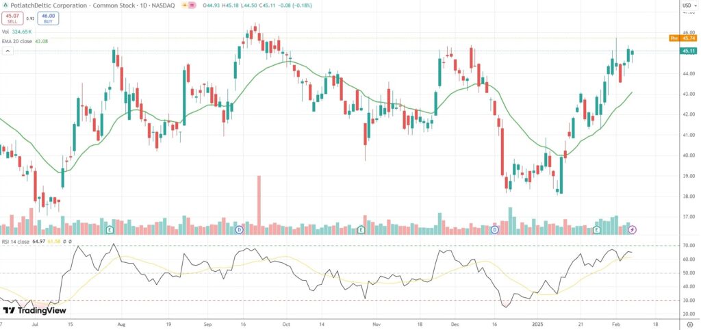 The shares of PotlatchDeltic Corp (PCH) closed 0.18% ($0.08) lower at $45.11 on Nasdaq on Friday.