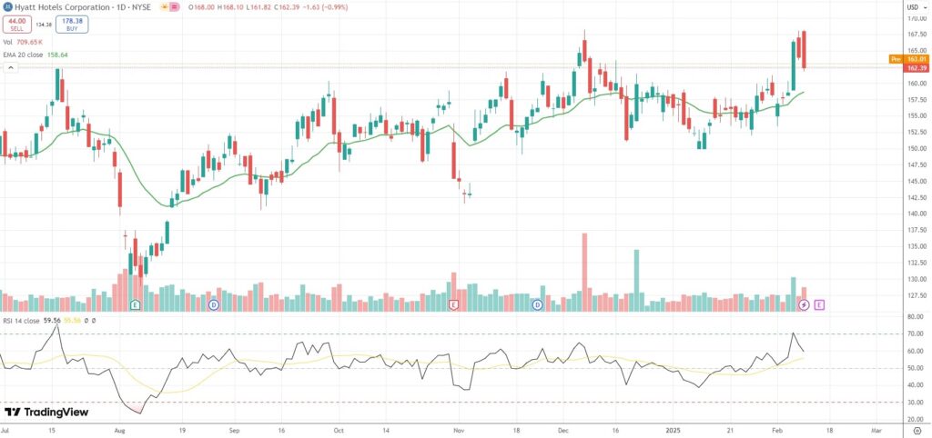 The shares of Hyatt Hotels Corp (H) closed 0.99% ($1.63) lower at $162.39 in New York on Monday.