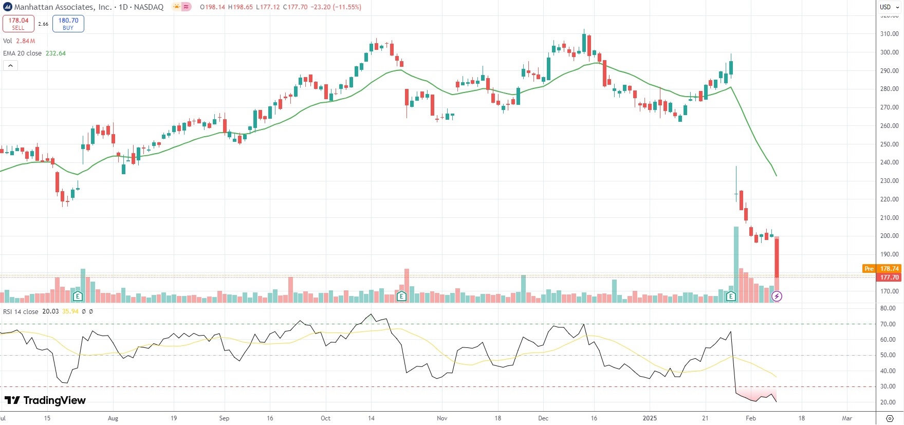 The shares of Manhattan Associates Inc (MANH) closed 11.55% ($23.20) lower at $177.70 on Nasdaq on Monday.